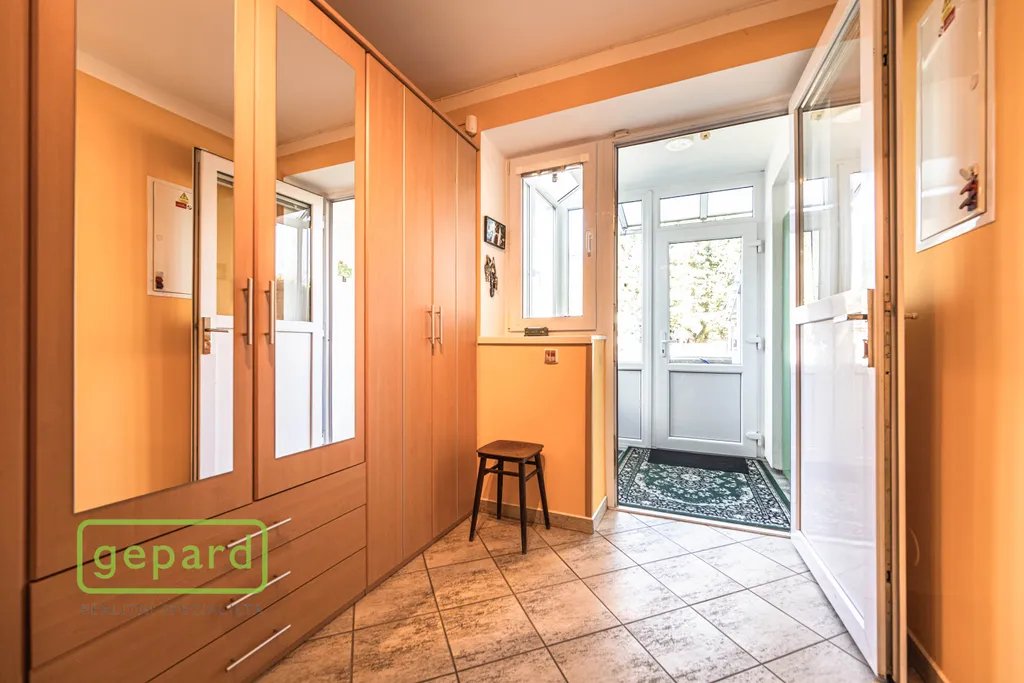 Přízemí: kryté zádveří, předsíň a chodba, koupelna se sprchovým koutem a WC, infrasauna, technická místnost, velký obývací pokoj s kuchyňským koutem, jídelnou a krbovými kamny je propojený s velkou krytou zimní zahradou se vstupem dále na vlastní zahradu. Zimní zahrada je navíc vybavena velkou roztahovací markýzou na el. pohon a celý objekt je chráněn i el. zabezpečením.