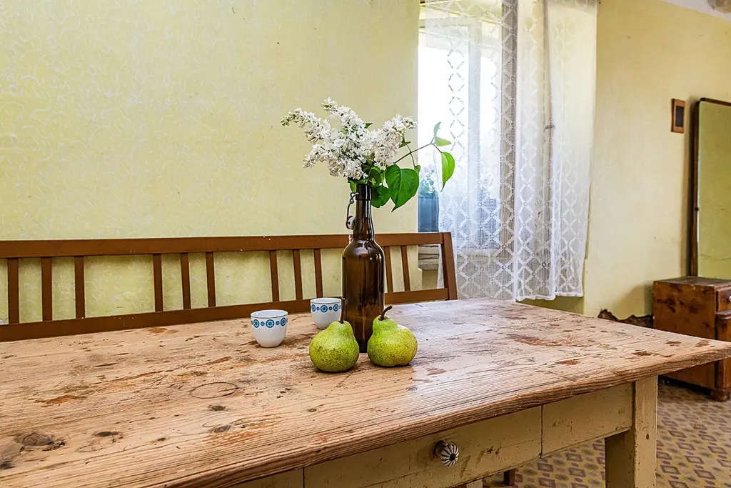Dispozice domu zahrnuje kuchyni s jídelním koutem, prostornou ložnici, obývací pokoj, další pokoj a koupelnu s vanou. Vytápění zajišťují krbová kamna umístěná v jednotlivých místnostech. Dřevěná okna i dveře jsou původní. Půdní prostory jsou aktuálně využívány jako úložné, do budoucna však nabízejí možnost vybudování dalších pokojů dle vašich potřeb.