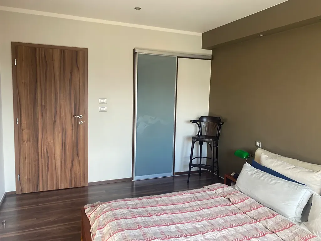 Dále byt nabízí dvě ložnice, šatnu, koupelnu se sprchovým koutem a samostatné wc a vstupní chodbu se šatními skříněmi.