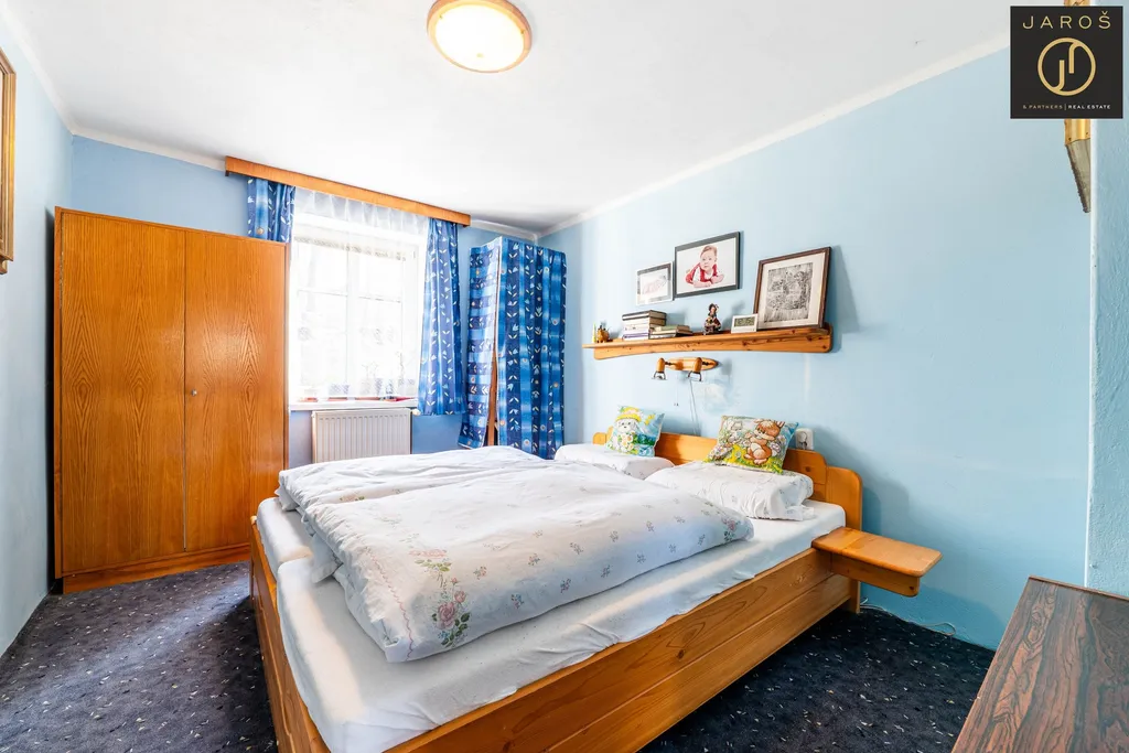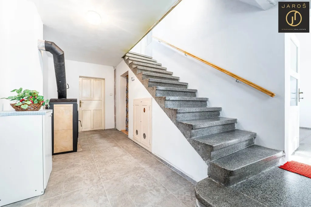 Vstup do domu vede přes zádveří do prostorné chodby, odkud je přístup do obývacího pokoje a samostatné kuchyně vybavené plynovou varnou deskou, elektrickým sporákem a digestoří. V přízemí se dále nachází koupelna s vanou a samostatné WC, kde je umístěn kombinovaný plynový kotel. Z chodby je vstup do klenbového sklepa a dále do dílny a skladovacích prostor. Po kamenném schodišti se dostaneme do druhého nadzemního podlaží, kde jsou tři obytné místnosti a vstup na prostornou půdu s potenciálem dalšího využití. Vytápění domu zajišťuje plynový kotel v kombinaci s krbovými kamny s výměníkem, což umožňuje úsporný provoz a příjemnou tepelnou pohodu. Dům je napojen na obecní vodovod, odpad je řešen septikem s pískovým filtrem. Elektroinstalace je v mědi s jističem 3×25 A. Na pozemku se nachází studna s užitkovou vodou. Střecha orientovaná na jih nabízí vhodné podmínky pro instalaci fotovoltaiky. Energetický štítek budovy (PENB) je ve fázi zpracování.
