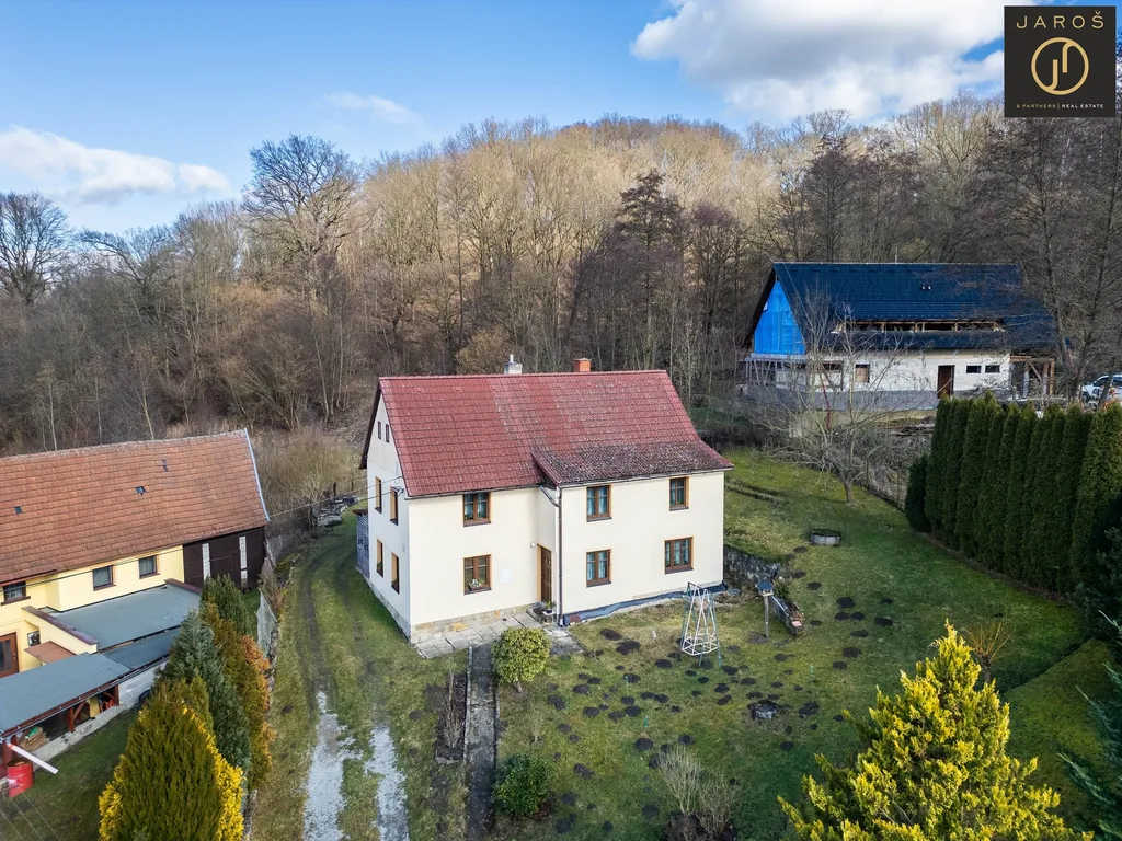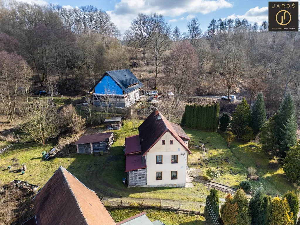 Pozemek kolem domu je zatravněný, mírně svažitý a poskytuje příjemné soukromí. Součástí je samostatná kůlna vhodná pro uskladnění zahradního nářadí nebo palivového dřeva a ze zahrady je přímý vstup do lesa.