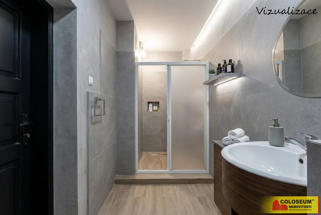 Koupelna je prostorná a nabízí možnost realizace sprchového koutu i vany. Toaleta je samostatná a umístěná na chodbě. Praktická chodba s podsvícenými nikami vytváří zajímavý designový prvek a zároveň poskytuje úložné možnosti, stejně jako šikovná spížka.