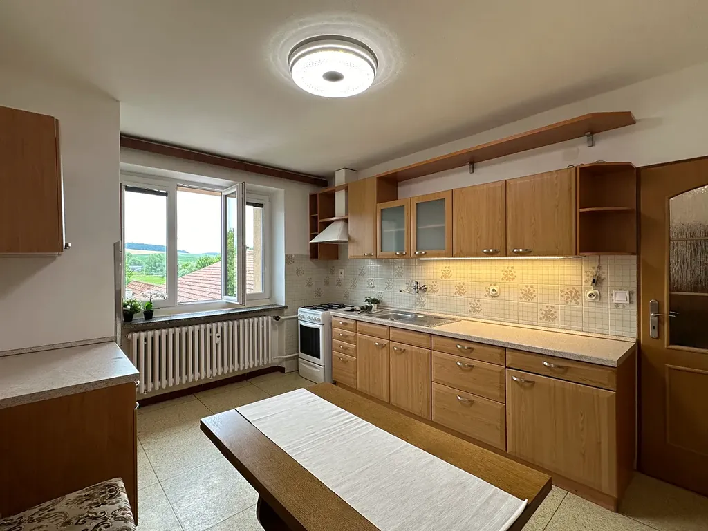Nabízíme slunný a prostorný byt ,80 m2, v zatepleném rodinném domě s plastovými okny s trojskly, 3 pokoje, kuchyň, koupelna a WC zvlášť, šatna, k dispozici je i možnost užívání zahrady, dvora, pergoly s posezením, udírny. Užívání garáže je za příplatek. Volně se dá parkovat před domem v ulici, kde jsou vyhrazená parkovací místa.