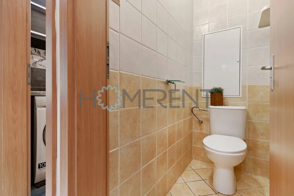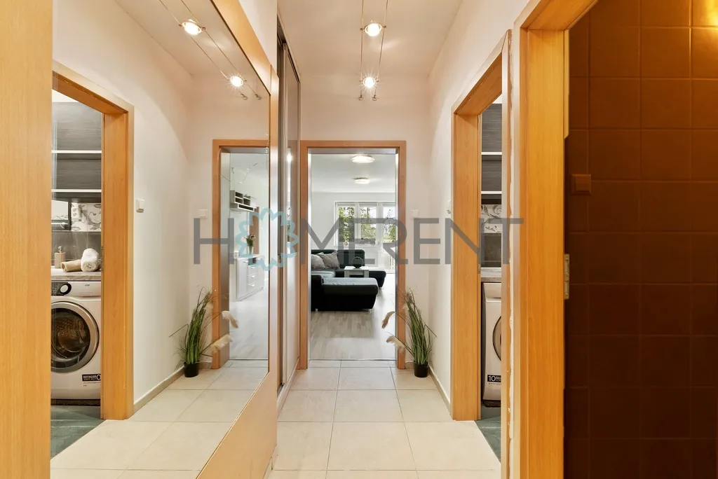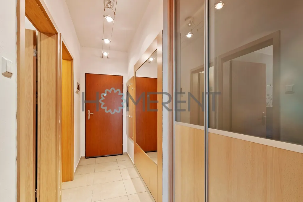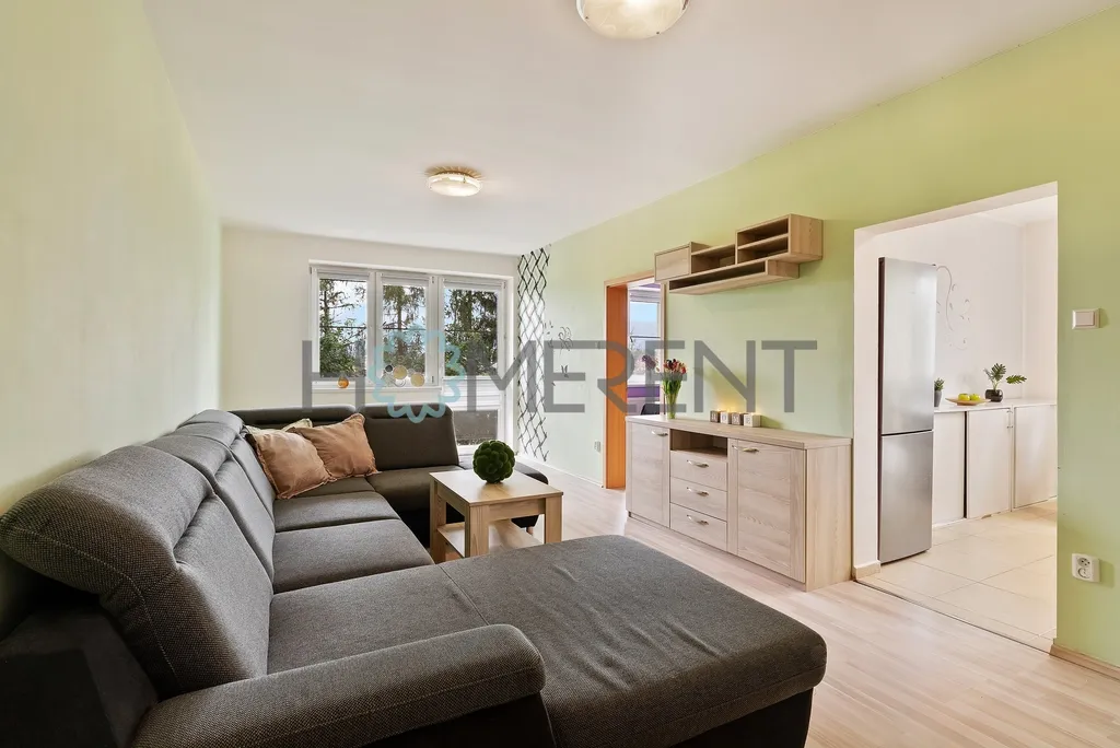 Byt je kompletně zařízený a jeho součástí je kuchyně s jídelním stolem, obývací pokoj, hlavní ložnice, dětský pokoj bez postele, koupelna s vanou a pračkou a samostatné WC. Součástí je i sklepní kóje.