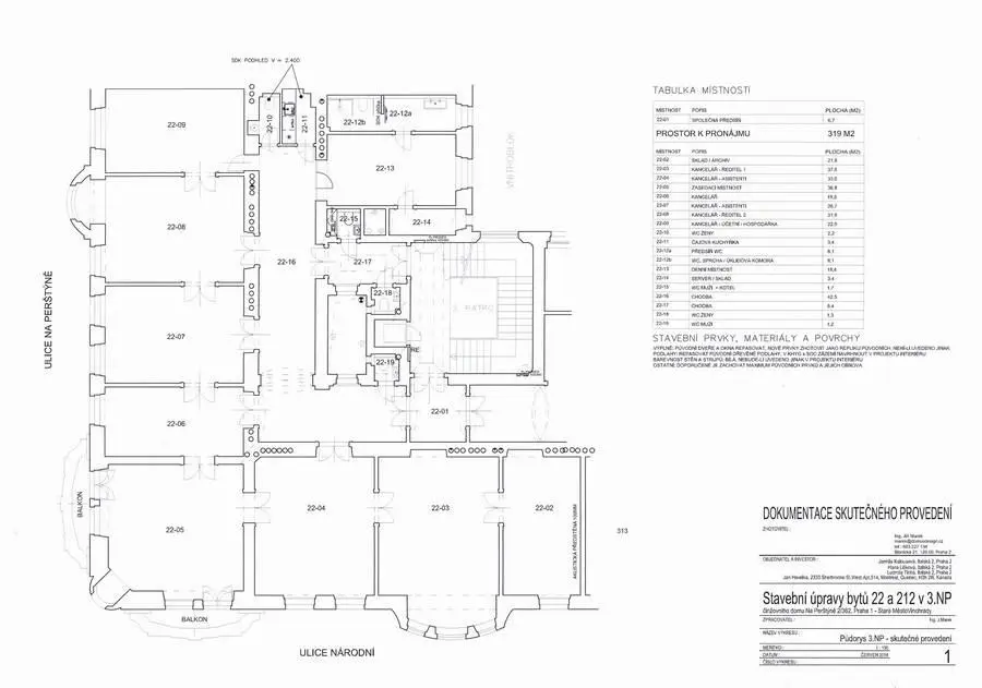 Prostory se nachází ve 2. patře renovovaného secesního domu s výtahem. Jsou velmi reprezentativní s vysokými stropy, dvoukřídlými dveřmi, zdobenými štuky a masivními parketami. Celý prostor je pod samostatným uzamčením, disponuje vstupní halou, 9 místnostmi, kuchyňkou a toaletou.