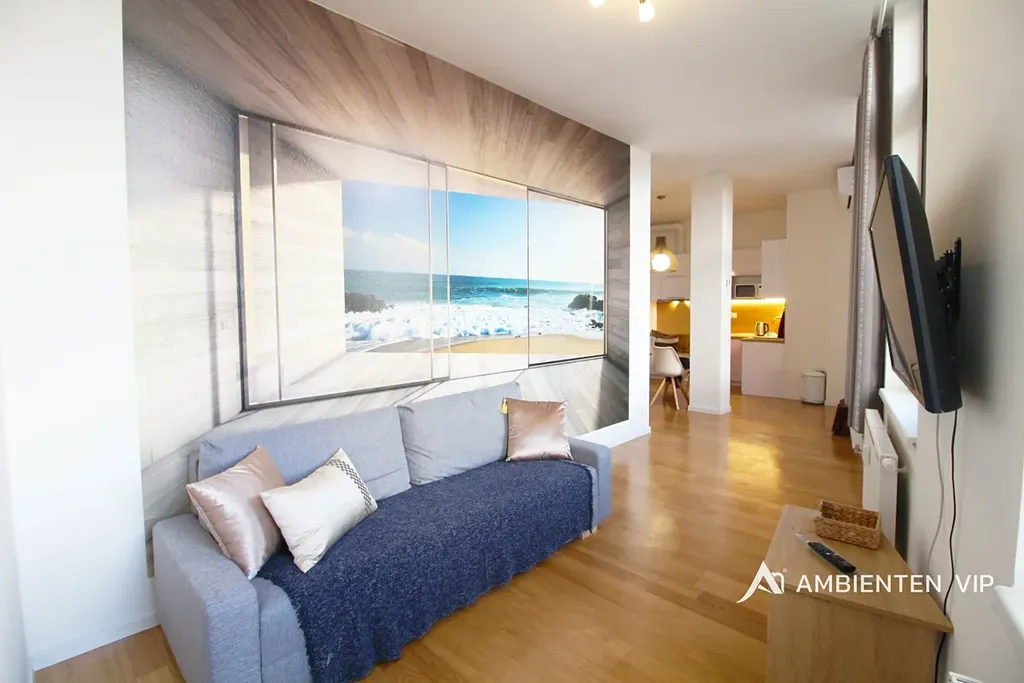 Interiér bytu byl navržen s důrazem na funkčnost, estetiku a kvalitu zpracování. Dispozice je řešena velmi efektivně tak, aby nabídla plnohodnotný a vzdušný prostor pro každodenní život. Plně vybavená kuchyňská linka s vestavěnými spotřebiči a jídelním koutem přirozeně navazuje na obývací část se stylovou sedačkou a chytrou televizí, která vytváří ideální zázemí pro relaxaci i společenské chvíle. Ložnicová část je elegantně oddělena závěsem, čímž si zachovává pocit soukromí a útulnosti, a disponuje přímým vstupem do moderní koupelny.