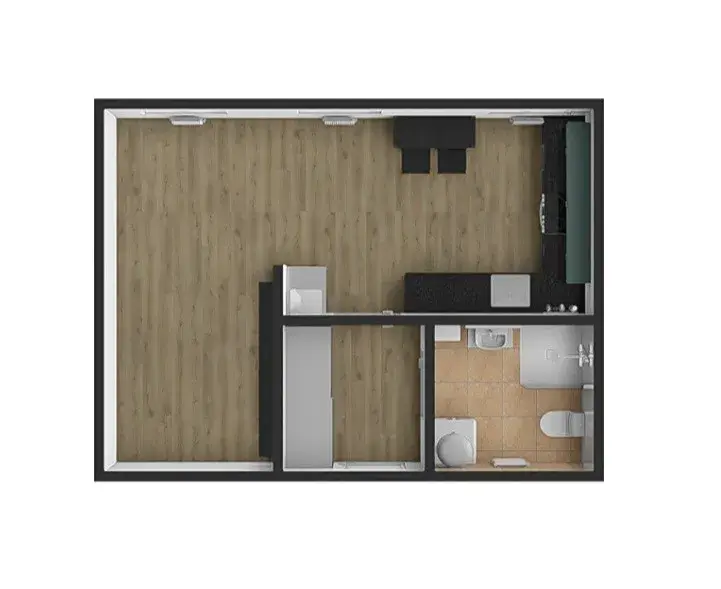 Bytová jednotka je v perfektním stavu a působí velmi prostorným dojmem.