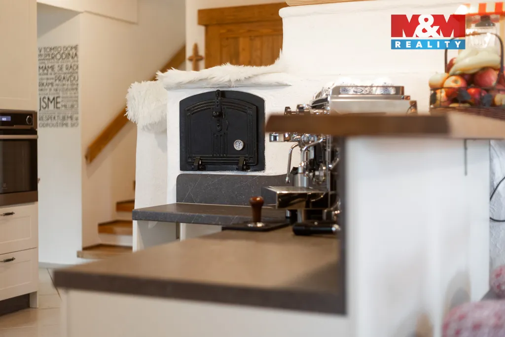 Dům se nachází na klidném místě, téměř na konci obce s přátelským sousedstvím, jehož tváří jsou jednoznačně pohádková kamna, která zdobí a propojují interiér a zároveň tak vyhřívají celé přízemí.