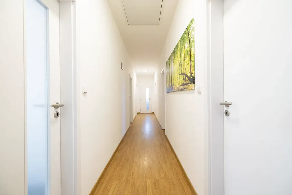 V celém domě je teplovodní podlahové vytápění a hlavní dominantou obývacího pokoje s kuchyní je potom rohový krb značky Hoxter, který vytopí celou obytnou část domu.