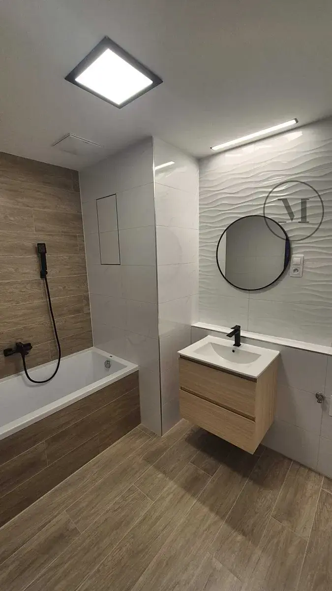 Moderní koupelna s vanou a přípojkou na pračku