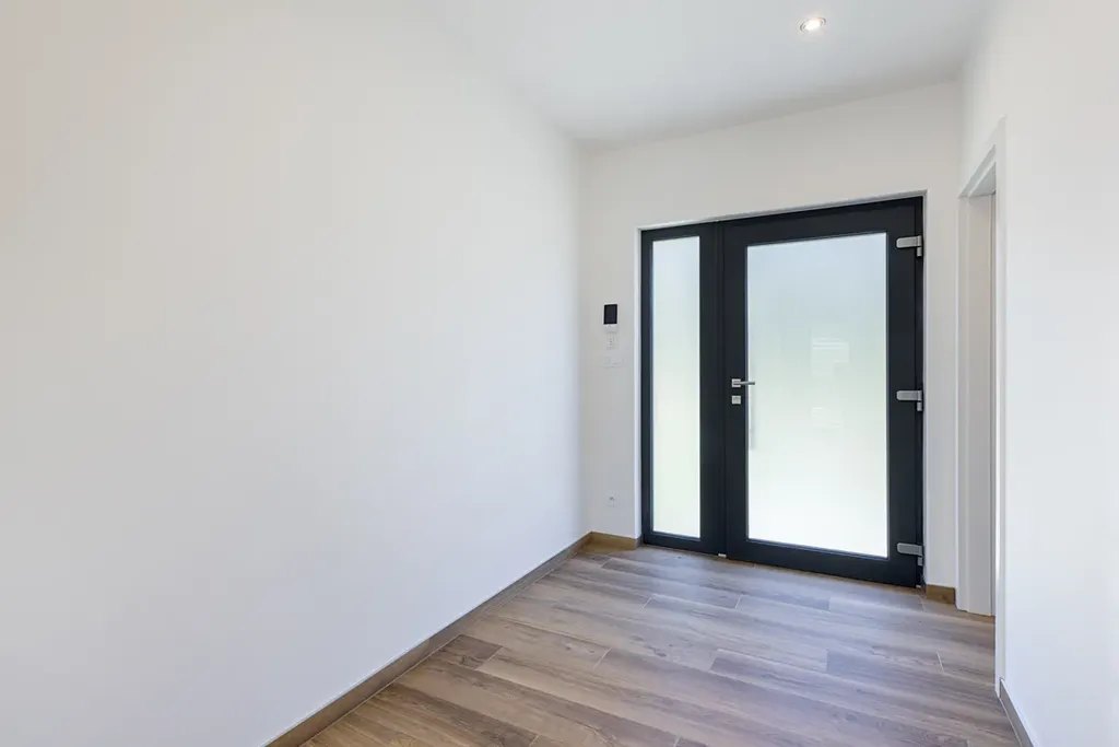 Interiér je promyšlený do posledního detailu – italská dlažba, luxusní koupelnové obklady, špičková sanita i stylové interiérové dveře Prüm. Velkoformátová posuvná okna HS Portál propojují vnitřní prostor s venkovní přírodou a dodávají domu vzdušnost a eleganci.