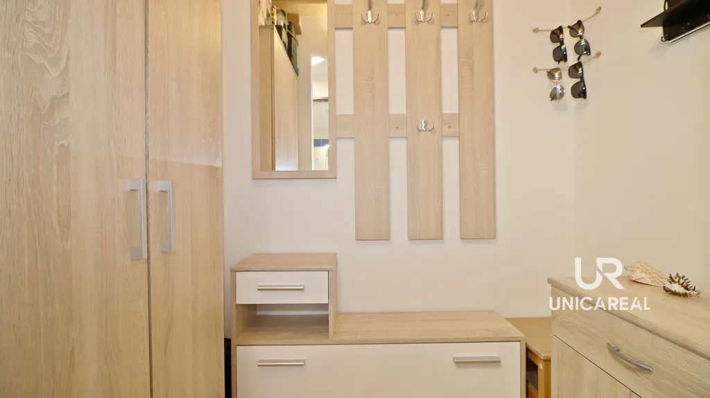 Ze vstupní chodby je vpravo ložnice, vlevo moderní kuchyňský kout propojený s prostorným obývacím pokojem. Odtud je vstup na prosluněnou lodžii s krásným výhledem do okolí.