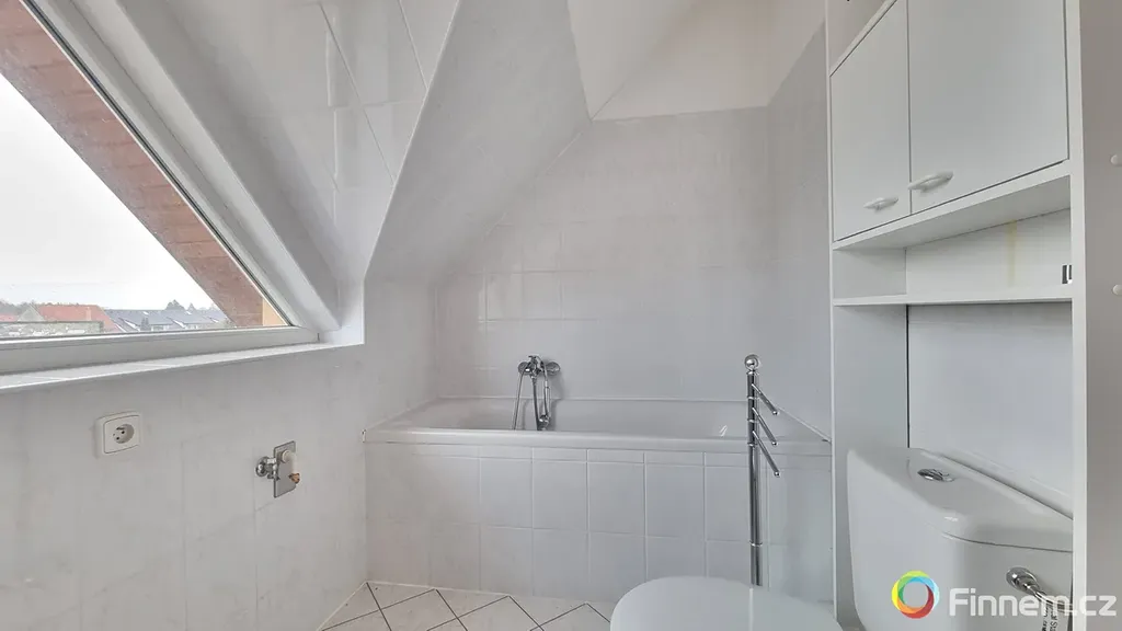 V patře jsou pak tři samostatné pokoje, každý vybavený velkou vestavnou skříní, hlavní koupelna s toaletou a chodba se schodištěm do přízemí.