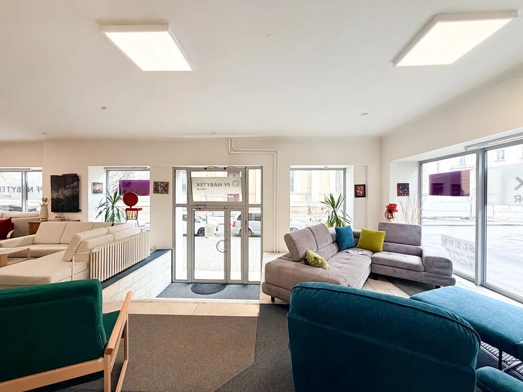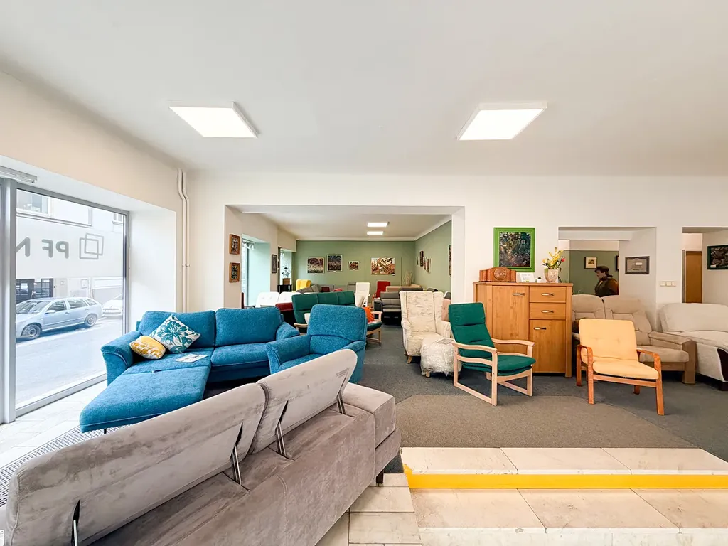 Prostor disponuje hlavní prodejní plochou o velikosti přibližně 150 m², která poskytuje flexibilní uspořádání dle potřeb nájemce. Významnou předností jsou velkoformátové prosklené plochy orientované do ulice, umožňující vytvoření atraktivních výloh a zajišťující výbornou viditelnost i přirozené prosvětlení interiéru.