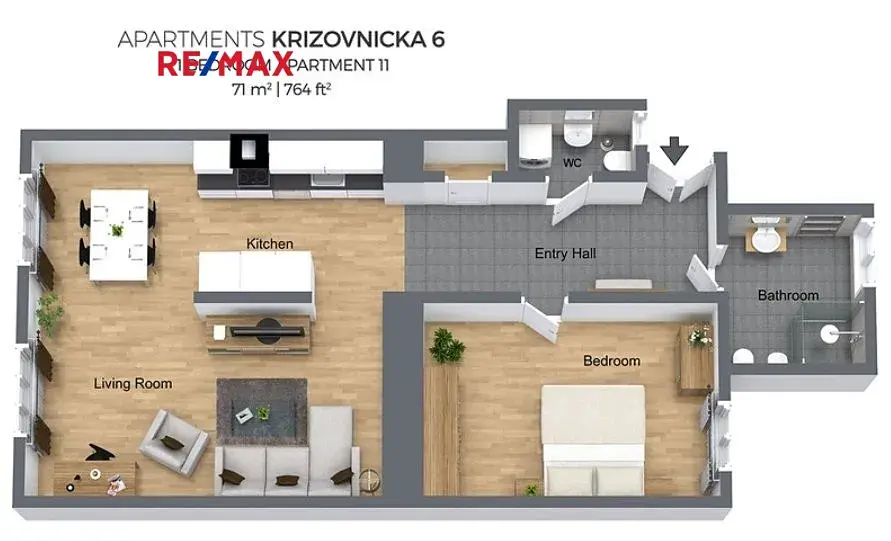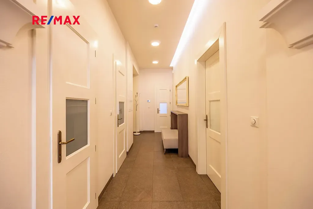 Prostorný, světlý interiér byl navržen s citem pro detail, kde se mísí moderní design s autentickými prvky, které podtrhují elegantní atmosféru tohoto bytu. Vstupní hala vás uvede do velkolepého obývacího pokoje, který je propojen s plně vybavenou kuchyní obsahující špičkové spotřebiče značek prémiové kvality (sporák, trouba, lednice, mrazák, myčka) a stylovou jídelní částí. Ložnice, prostorná koupelna i samostatné WC jsou zárukou pohodlí a soukromí. V celém bytě se nachází kvalitní dřevěná podlaha s podlahovým vytápěním, a komfort doplňuje moderní bezpečnostní systém. Byt je připraven k okamžitému nastěhování – vybavení odpovídá fotografiím.