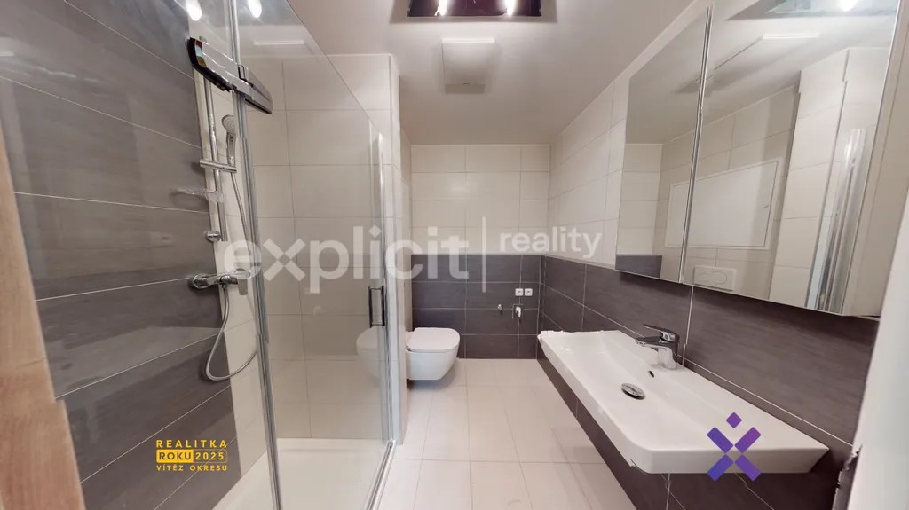 Při vstupu do bytu se nachází prostorná předsíň, která je vybavená velkou šatní skříní. Z předsíně vedou dvě místnosti. Jednou z nich je koupelna s WC, sprchovým koutem, přípravou pro pračku i sušičku, dále je doplněna umyvadlem s úložnou skříňkou a se zrcadlem.