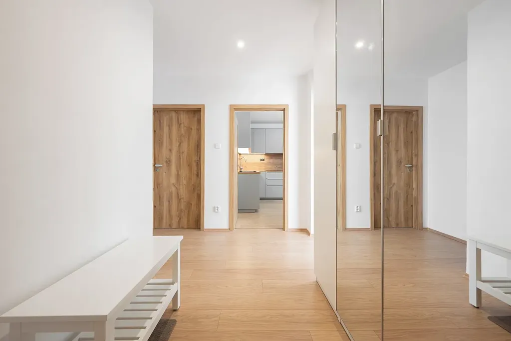 Vstupní chodba bytu je vybavena šatní skříní. Je zde i dostatek místa na botník a odkládání obuvi. Velkoformátové zrcadlo prostor opticky zvětšuje a prosvětluje. Chodba je centrem celého bytu, z níž se vstupuje do jednotlivých neprůchozích pokojů a koupelny.