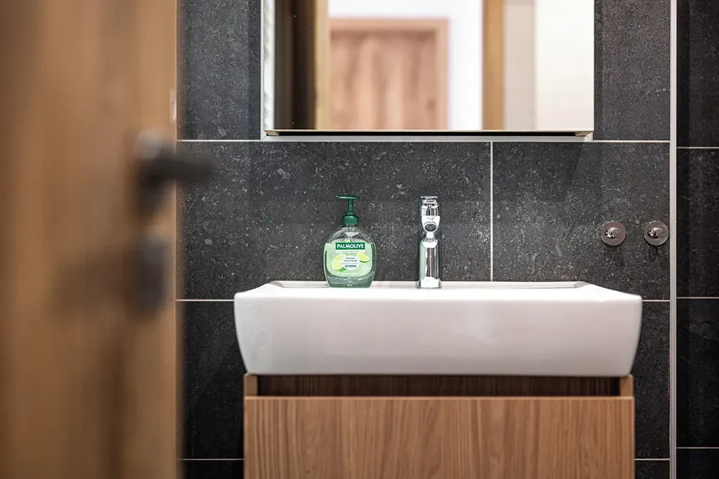 Koupelna s toaletou je prostorná s velkým sprchovým koutem. Je zde také umístěna pračka se sušičkou.