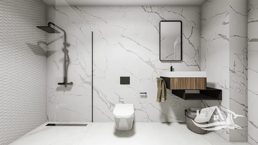 Interiér kombinuje moderní design s praktickými prvky pro každodenní život. Podlahy z porcelánové dlažby zajišťují elegantní vzhled a snadnou údržbu, vestavěné skříně poskytují dostatek úložného prostoru a plně vybavená kuchyně s vestavěnými spotřebiči umožňuje okamžité užívání domu. Komfort zvyšují moderní technologie, mezi které patří domácí automatizace, elektrické rolety, videotelefon a předinstalace klimatizace. Energetickou efektivitu podporuje aerotermální systém ohřevu vody a kvalitní tepelná izolace.
