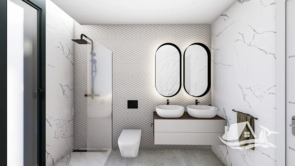 Každý dům je navržen s důrazem na funkčnost, světlo a přirozené propojení interiéru s venkovním prostorem. Dispozice nabízí tři ložnice a tři koupelny, takže poskytuje dostatek prostoru pro rodinné bydlení i pohodlné pobyty s přáteli. Obytná část s kuchyní tvoří přirozené centrum domu a díky otevřenému řešení působí vzdušně a moderně. Celková zastavěná plocha domu je přibližně 121 m² a praktické rozvržení zajišťuje pohodlí při každodenním užívání.