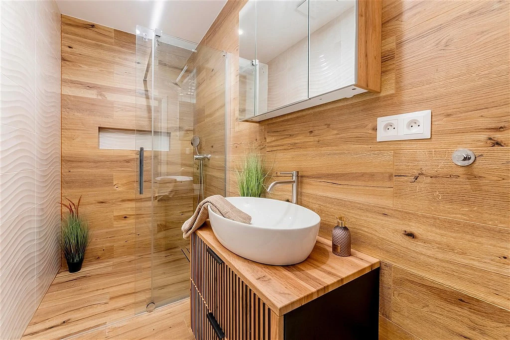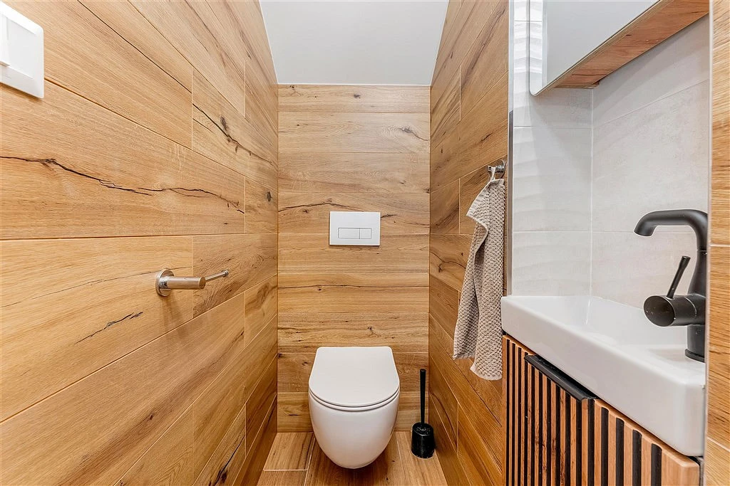 ___ Z obýváku přes zádveří vstoupíte do klidové části přízemí. Najdete zde jeden pokoj s okny do ulice a druhý pokoj/ložnice s prosklenými dveřmi, umožňujícími vstup přes menší terasu na zahradu. Mezi oběma pokoji je pak velmi pěkná koupelna s prosklenou sprchou a odtokovým žlabem. V technické místnosti, sloužící i jako komora, umístěné vedle předsíně, je elektrický kotel, pračka a je tam dost místa na sušičku i úklidové předměty.
