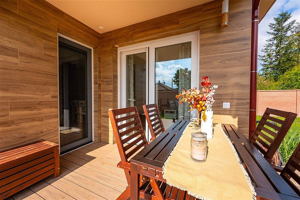 ___ Hlavní prostor domu tvoří obývací pokoj (26 m²) s přiléhající otevřenou kuchyní (10 m²). V kuchyni nová kuchyňská linka se všemi spotřebiči. Prostorný obývák zdobí stylový výkonný krb, přičemž teplo, které vytváří, je průduchy rozváděno do obou podlaží. Za portálovými balkónovými dveřmi navazuje na obývák jeho letní část, tj. zastřešená terasa s jídelním stolem, případně i s grilem, která tak zvětšuje obytný prostor domu o další metry.