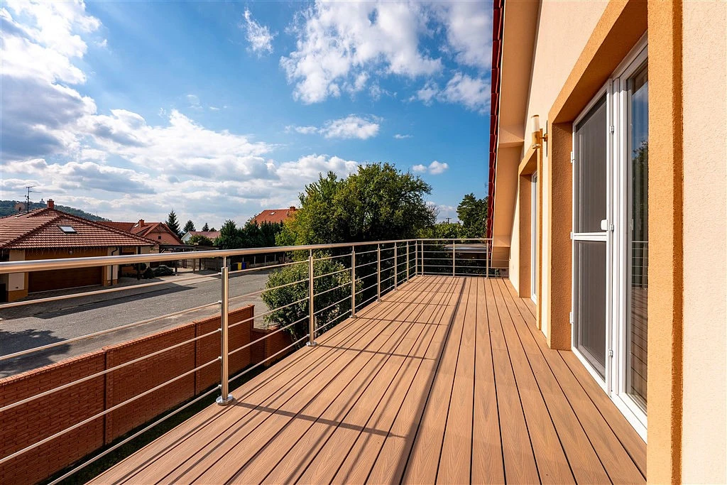 ___ Po masivních dřevěných schodech vyjdete do podkrovní haly, která nabízí vstup do čtyř pokojů a do koupelny s mohutnou rohovou vanou a WC. Tři pokoje jsou ve standardní velikosti kolem 12 m² a jeden má na podkroví úctyhodných 17 m². Ze dvou pokojů se dá vyjít prosklenými dveřmi na rozměrnou terasu (18,3 m²), s výhledem mj. i na Svatý kopeček.