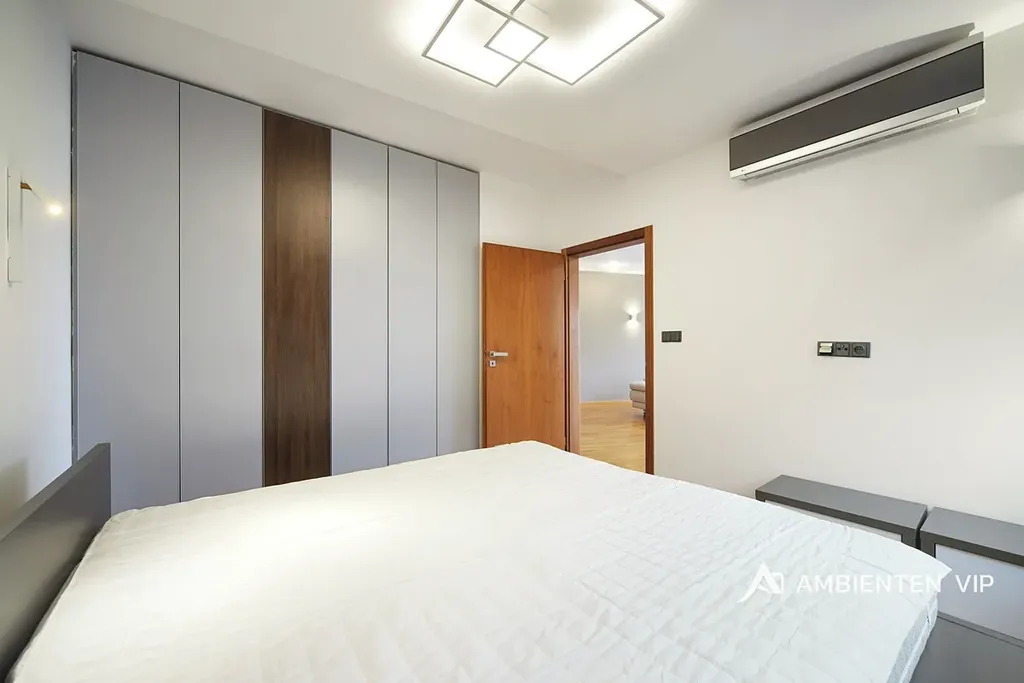 Vybavení bytu: moderní kuchyňská linka na míru s veškerými spotřebiči (varná deska, trouba, digestoř, mikrovlnná trouba, chladnička, myčka nádobí), pračka, vestavěné skříně, postele, obývací stěna, televizor, sedací souprava, konferenční stolek, světla, dřevěné dveře a podlahy, venkovní elektrické žaluzie a klimatizace.