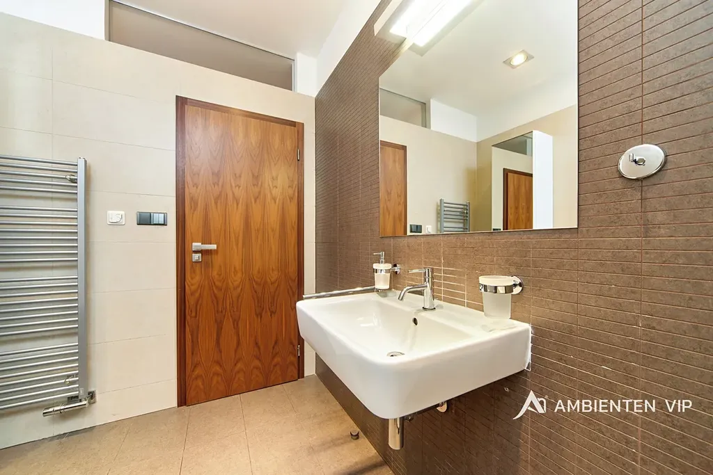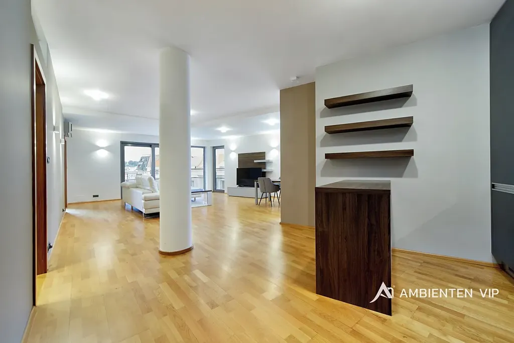 Prostorný byt o podlahové ploše 93,2 m2 s balkónem o velikosti 7,6m2 se nachází ve 5. patře moderní budovy s výtahem. Byt disponuje ložnicí a pokojem, dále prostorným kuchyňským koutem s obývacím prostorem o velikosti 44 m2, z kterého je přímý vstup na balkón s pěkným výhledem do zeleně a zahrady. Všechny pokoje jsou vybaveny nábytkem. Nájemník se tak může nastěhovat pouze s osobními věcmi a může ihned bydlet.