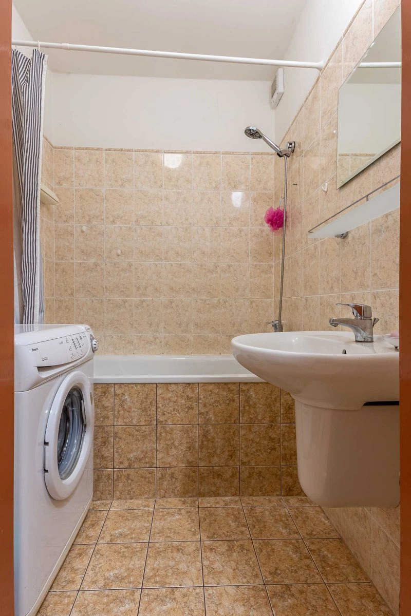 Byt se nabízí vybavený. Kuchyňská linka disponuje lednicí, elektrickou troubou, mikrovlnnou troubou, sklokeramickou deskou a digestoří. V kuchyni je i jídelní stůl s židlemi a komoda. Obývací část je útulně zařízená pracovním stolem s židlí, konferenčním stolkem a za praktickou zástěnou najdeme postel a šatní skříň. Součástí koupelny je vana a umyvadlo. Toaleta je oddělená.