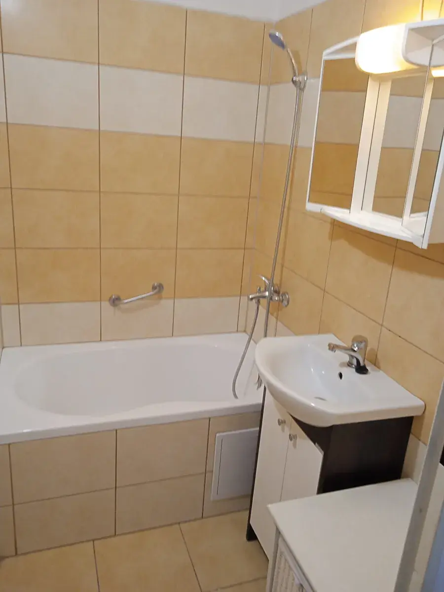 Koupelna: Zděné a obložené jádro s novější sanitou (vana a umyvadlo se skříňkou).