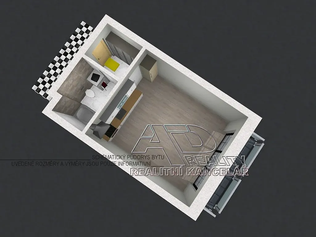 Dispozice: předsíň [3,3m2], obytná místnost s kuchyňským koutem [23,3m2] s balkonem [5,2m2], koupelna s WC [4,6m2]. K dispozici je sklepní koje v 1.NP (přízemí) objektu o výměře cca [2,8m2]. K dispozici je jedno vyhrazené kryté (vnitřní) parkovací místo pod domem.