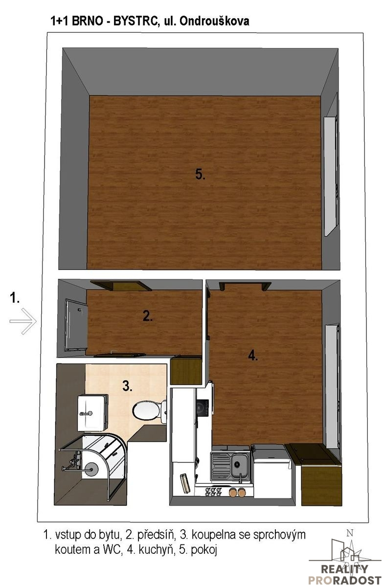 Nabízíme k pronájmu prostorný byt o velikosti 1 + 1 na ulici Ondrouškova v městské části Brno - Bystrc. Nachází se v 8.p./8. udržovaného panelového domu a má podlahovou plochu 33 m2. Byt je orientovaný na východ.