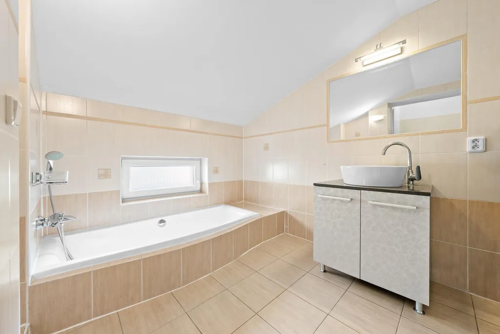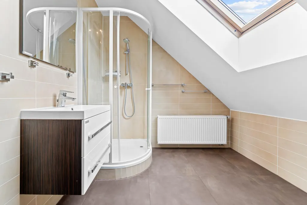 Ložnice s balkonem, pokoj s francouzským oknem, velká pracovna či pokoj pro hosty, šatna a podkrovní koupelna. Půdní prostory jsou aktuálně nevyužité a nabízejí další potenciál.