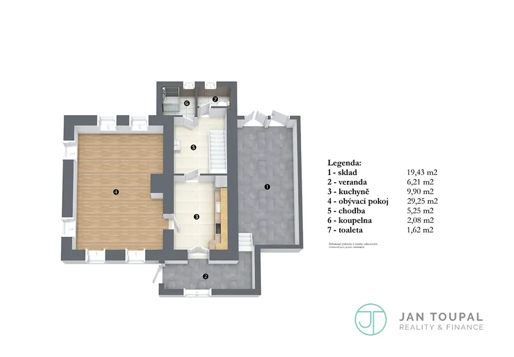 Suterén: Samostatný vchod, obytná místnost, ideální pro posezení s přáteli. Dále se zde nachází sklep se dvěma místnostmi a studnou, ze které jsou rozvody po celém domě, a prostorná kůlna se vchodem z domu i z venku. Ze suterénu vedou schody do dalšího patra.