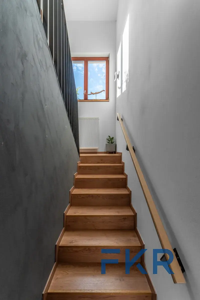 Horní podlaží tvoří klidovou část domu určenou pro odpočinek i soukromí. V patře se nacházejí tři samostatné pokoje, šatna, oddělená toaleta a velká koupelna. Přirozené denní světlo vytváří díky velkým oknům a vhodné orientaci příjemnou atmosféru v každé místnosti. Předokenní stínění přispívá k vyššímu komfortu a pravidelné dispozice pokojů usnadňují jejich praktické uspořádání.