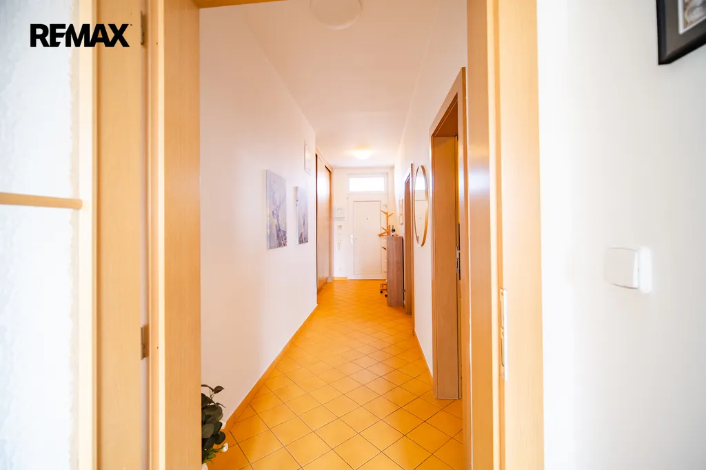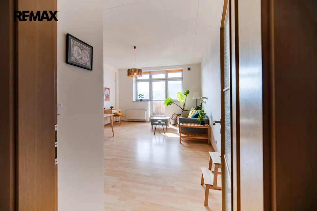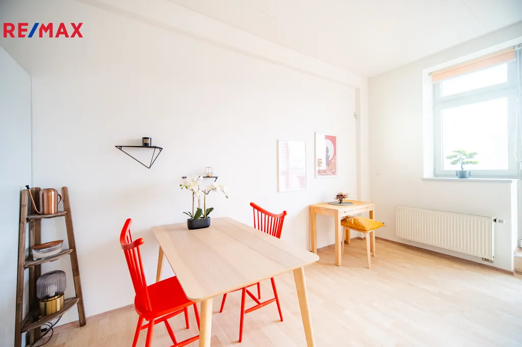 Dominantou bytu je světlý obývací pokoj s kuchyňským koutem a jídelní částí o velikosti téměř 30 m², který poskytuje příjemný prostor pro každodenní život i setkávání s přáteli.