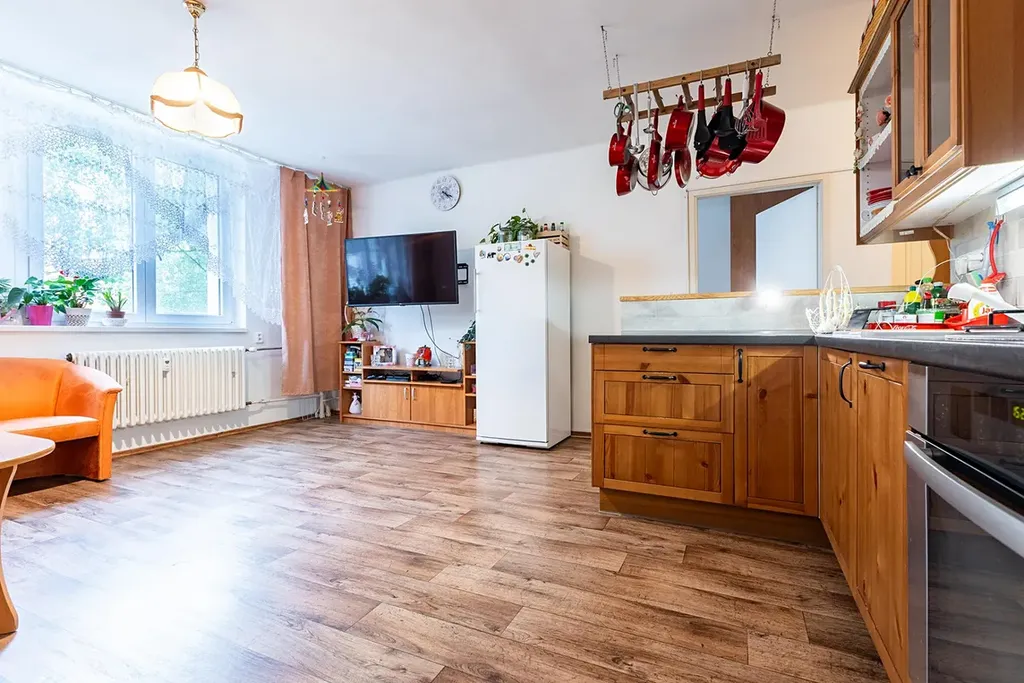 Velkou výhodou bytu je promyšlená a velmi funkční dispozice, kde jsou jednotlivé pokoje oddělené a samostatně přístupné, což zajišťuje dostatek soukromí pro každého člena domácnosti. Centrem bytu je prostorný a světlý obývací pokoj s kuchyňským koutem, který přirozeně slouží jako hlavní místo setkávání celé rodiny. Díky velkým oknům působí byt velmi vzdušně a příjemně.