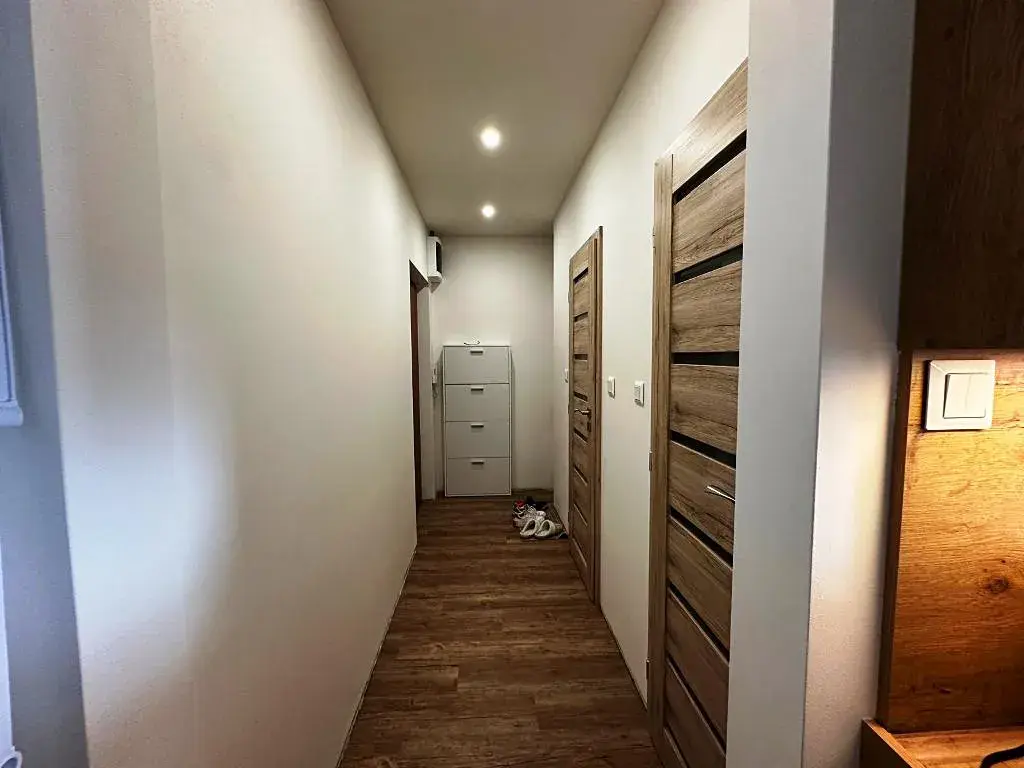 Dispoziční řešení bytu 2+kk o celkové výměře 45 m2. K bytu náleží vlastní balkon se vstupem ze společné chodby. Byt je po kompletní rekonstrukci. Zděné koupelnové jádro s rohovou vanou, skříňkou a pračkou, zůstává kuchyňská linka vč. spotřebičů, šatní skříň, nábytek v předsíni, jinak byt zůstává bez zařízení.