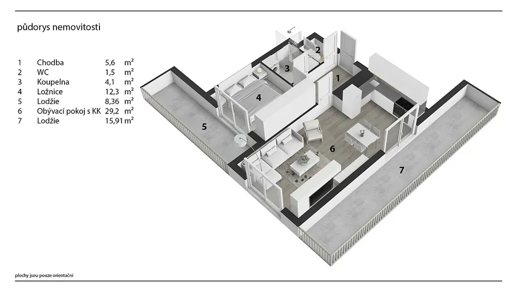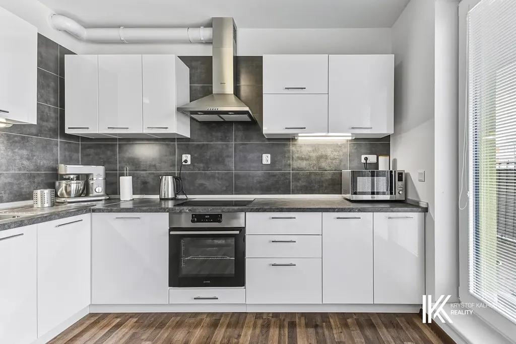 Srdcem bytu je velkorysý obývací pokoj s kuchyňským koutem, který tvoří otevřený a vzdušný prostor, přirozeně prosvětlený ze dvou stran. Kuchyňský kout je elegantně zakomponovaný tak, aby byl plně funkční, ale nerušil obytnou část. Z vestavěných spotřebičů nabídne sklokeramickou varnou desku, troubu s digestoří a myčku nádobí. Z tohoto prostoru vstupujete na velkou terasu cca 16 m2 orientovanou na západ. Ta přirozeně rozšiřuje obytný prostor a dává bytu další rozměr. Představte si letní západy slunce, bylinky v květináčích a klidná posezení s výhledem na střechy okolních domů.