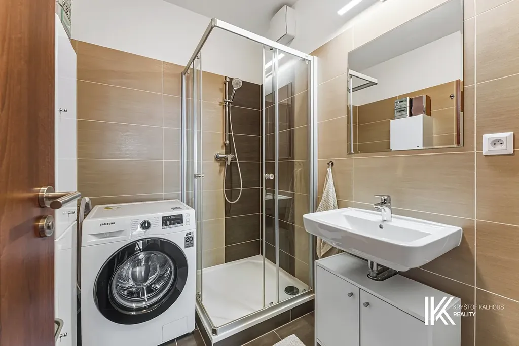 Koupelna je vybavena sprchovým koutem a působí moderně a čistě. Toaleta je samostatná, což zvyšuje komfort každodenního fungování, zejména pokud v bytě bydlí pár nebo přijde návštěva.
