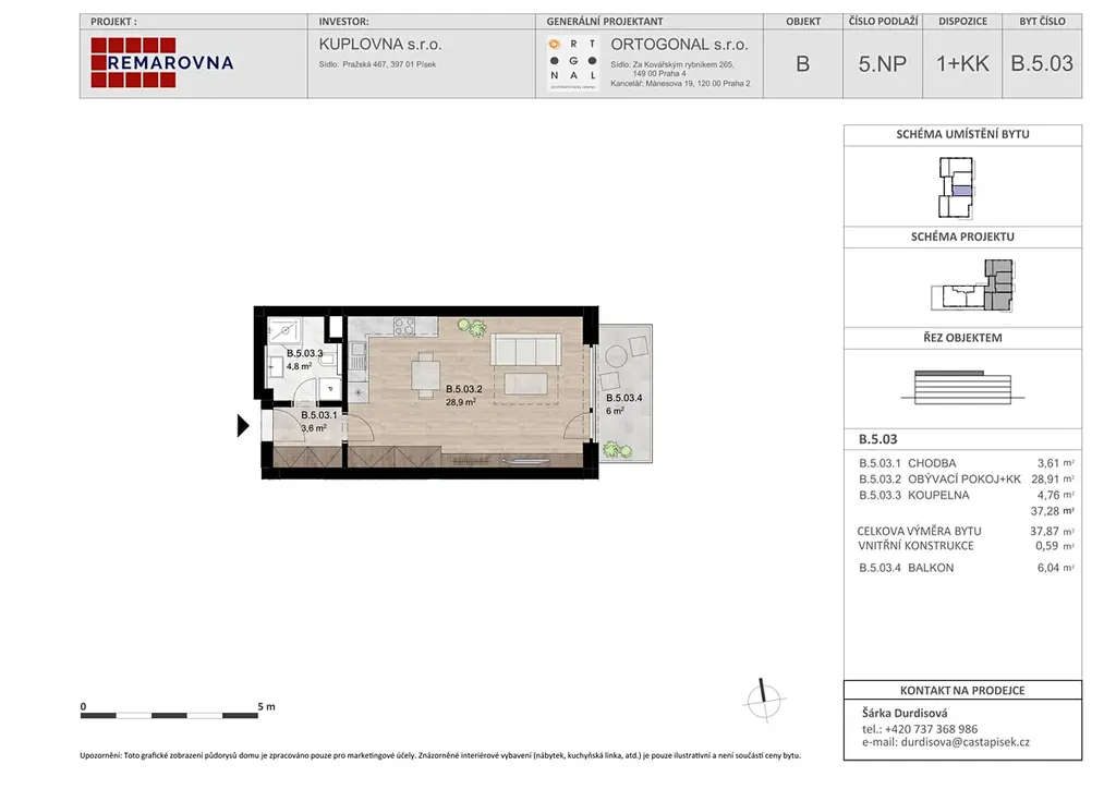 Nabízíme k pronájmu byt 1+kk o velikosti 38 m2 v 5.NP nově postaveného bytového domu REMAROVNA, který je umístěn nedaleko centra města Písku, ve vnitrobloku mezi ulicemi Pražská a V Portyči. K bytu náleží také sklep 2 m2 a parkovací stání "P09" ve společné garáži v suterénu domu. Cena pronájmu parkovacího stání je 1.500,- Kč a není zahrnuta v nájemném za byt. Celkem tedy čisté nájemné včetně parkovacího stání činí 13.000,- Kč. Byt je orientovaný na východní stranu směrem do zahrady sousedního domu s výhledem na město.