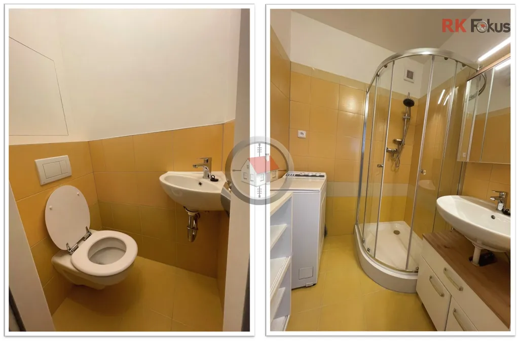 Koupelna je vybavena komfortním sprchovým koutem, umyvadlem se skříňkou, zrcadlovou skříňkou, skříňkami na ručníky a pračkou.