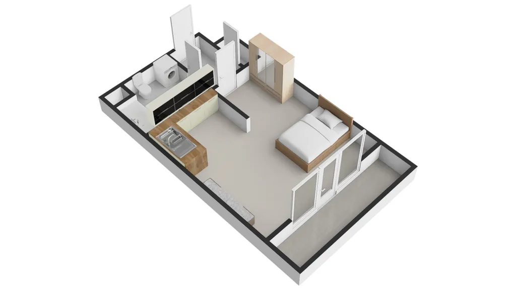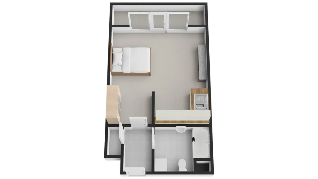Světlý a tichý byt o dispozici 1+kk se nachází ve čtvrtém nadzemním podlaží moderního rezidenčního domu v Randově ulici na Smíchově.