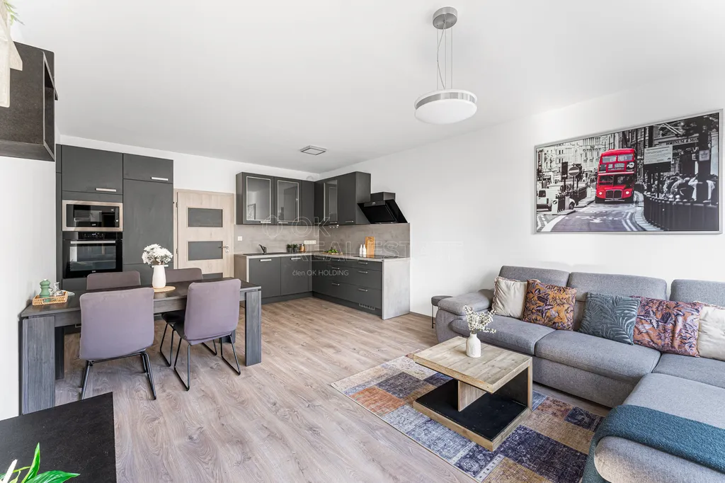 Hlavní obytná zóna (28,6 m²) je rozdělena do tří částí. Plně vybavená kuchyně plynule navazuje na jídelní prostor a ten dále přechází do klidové části určené k relaxaci. Na balkon vstoupíte jak z obývacího pokoje, tak z ložnice.
