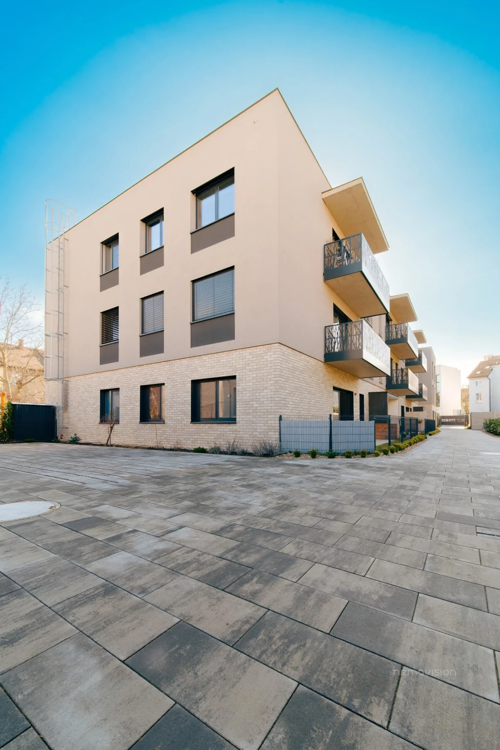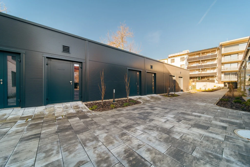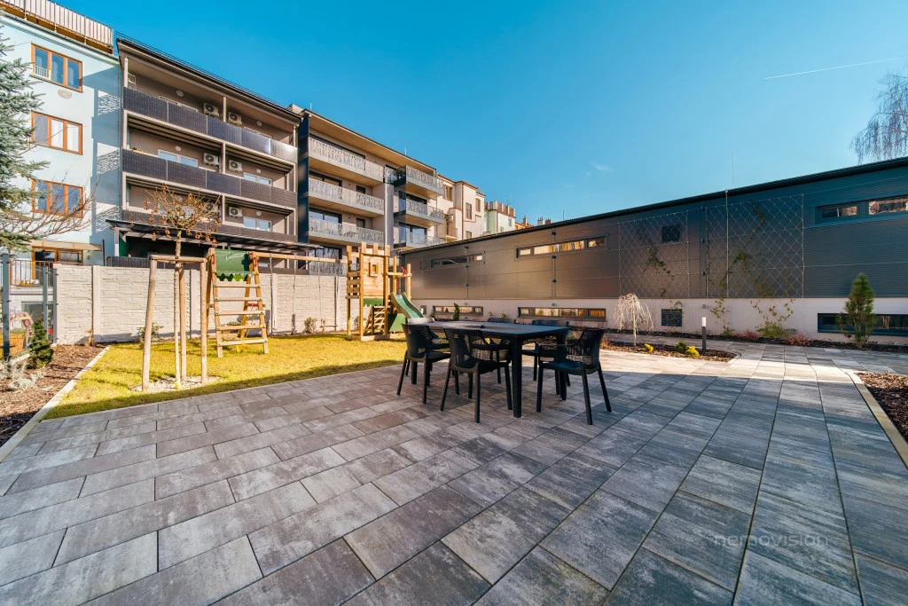 Obyvatelé domu mohou využívat také uzavřený vnitroblok s dětským hřištěm, což ocení především rodiny s dětmi.