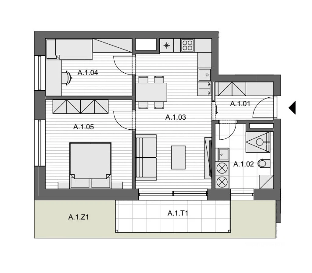 Interiér bytu je světlý a vzdušný, díky velkým oknům je celý prostor přirozeně prosvětlený. Moderní vybavení, kvalitní materiály a podlahové vytápění vytvářejí komfortní prostředí pro každodenní život. Dispozice bytu je navržena tak, aby poskytovala dostatek prostoru jak pro rodinné bydlení, tak i pro klidné zázemí pro práci z domova.