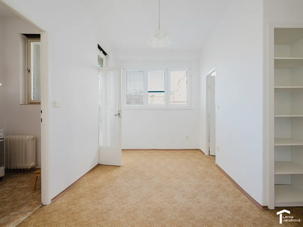 Po vstupu do bytu se ocitáme v prostorné chodbě, ze které vejdeme do kuchyně, která je spojená s jídelnou a je zde k dispozici špajz. Z chodby dále projdeme do dvou samostatných pokojů. Z jednoho pokoje je vstup na lodžií. Koupelna je osazena vanou a WC je oddělené. Na chodbě jsou k dispozici šatní skříně.