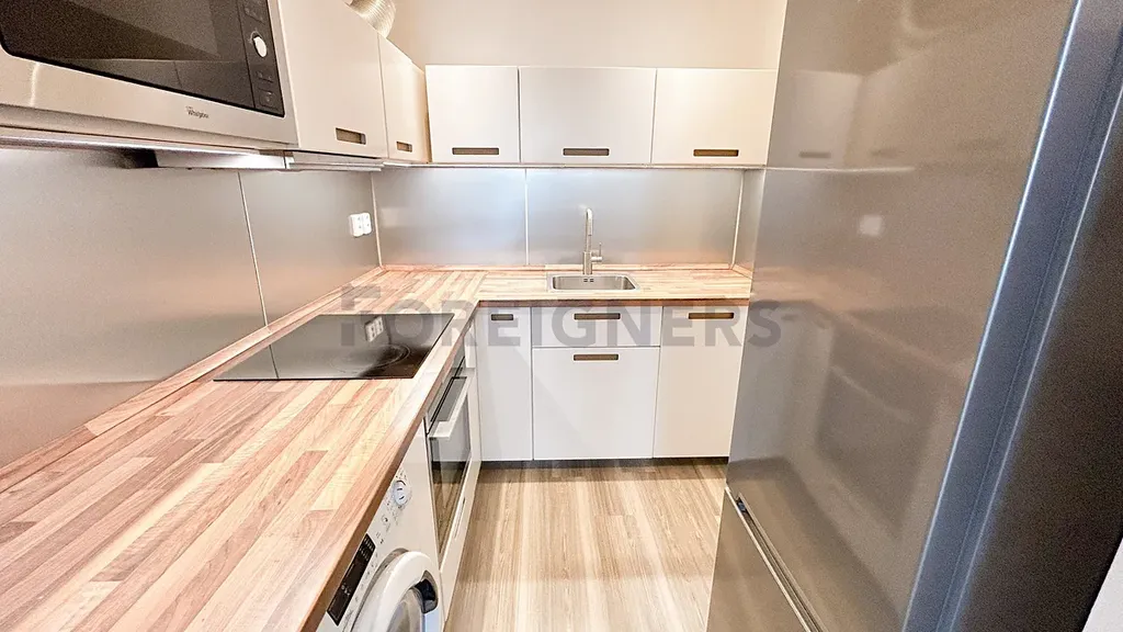 Byt je čerstvě vymalován a připraven k okamžnému nastěhování. Sestává z prostorného obývacího pokoje s moderní kuchyňskou linkou vybavenou kvalitními spotřebiči (trouba, sklokeramická varná deska, lednice s mrazákem, myčka nádobí, mikrovlnná trouba). V obývacím prostoru se nachází pohodlná sedací souprava, konferenční stolek, TV a obývací stěna.