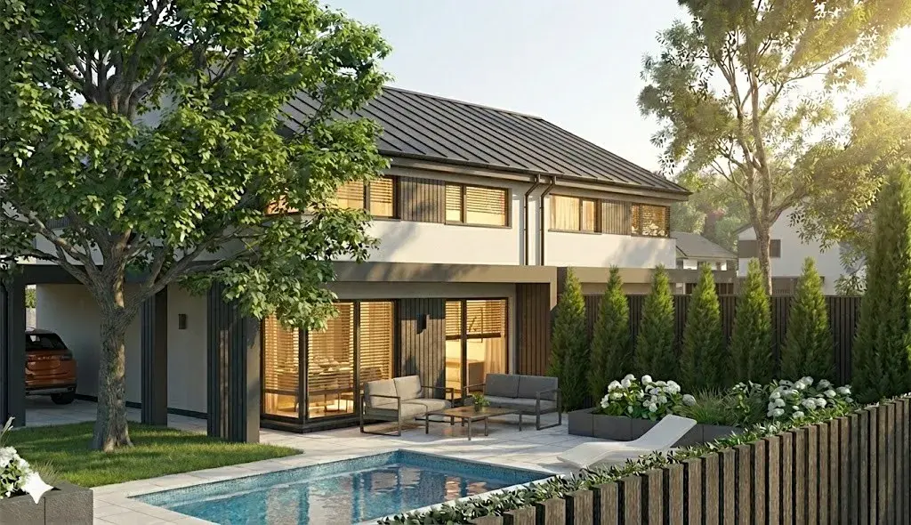 Vzhled: Elegantní plechová střecha v odstínu antracit.